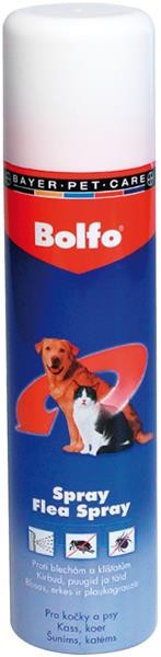 Bolfo spray je přípravek pro psy a kočky proti blechám, klíšťatům, vším a všenkám. Účinkuje na parazity přímo v srsti napadeného zvířete a v jeho okolí. Přípravek poskytuje ochranu až 5 měsíců před blechami a 10 týdnů před klíšťaty.