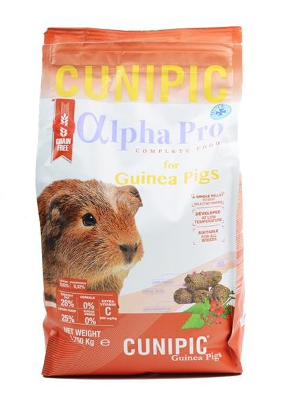 Cunipic Alpha Pro Guinea Pig – morče. Kompletní krmivo bez obsahu obilovin. Zdravá, velice chutná a vyvážená receptura pro morčata. Každá granule obsahuje všechny nezbytné suroviny a vitamíny pro zdraví morčete bez výkyvů v příjmu živin. Krmivo s vysokým obsahem vlákniny (25 %), bez přidaných barviv a cukrů vhodné pro všechna plemena.