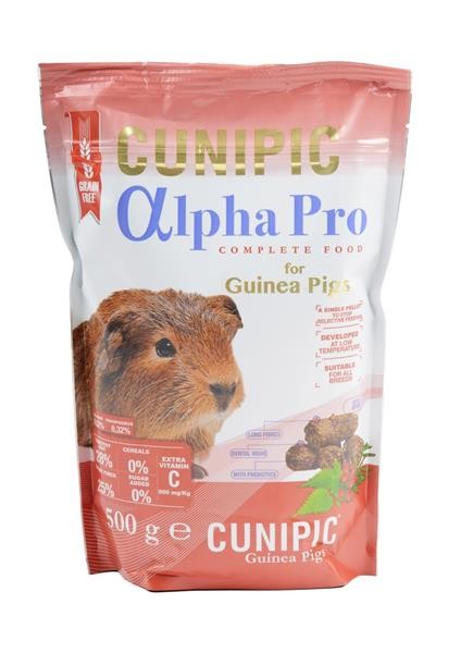 Cunipic Alpha Pro Guinea Pig – morče. Kompletní krmivo bez obsahu obilovin. Zdravá, velice chutná a vyvážená receptura pro morčata. Každá granule obsahuje všechny nezbytné suroviny a vitamíny pro zdraví morčete bez výkyvů v příjmu živin. Krmivo s vysokým obsahem vlákniny (25 %), bez přidaných barviv a cukrů vhodné pro všechna plemena.