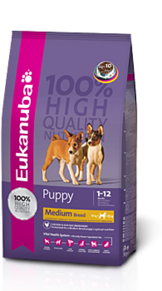 Štěňata středně velkých plemen mají vlastní výživové nároky. Tato strava Eukanuba dodává optimální množství proteinů, tuku a karbohydrátů na pokrytí těchto nároků. Poskytuje všechny důležité vitamíny a minerály nezbytné pro optimální růst. Obsahuje přísady vysoké kvality a velké množství živočišných proteinů, z nichž kuřecí maso představuje hlavní zdroj.