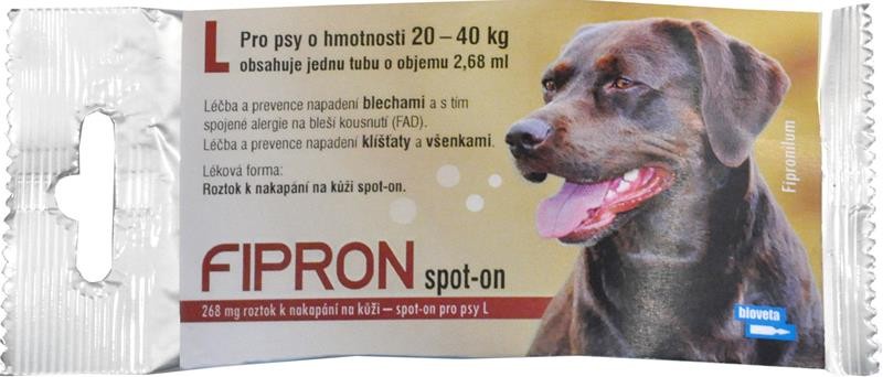 FIPRON 268 mg SPOT-ON roztok pro nakapání na kůži je antiparazitikum pro léčbu a prevenci napadení blechami a klíšťaty u psů a pro léčbu a kontrolu alergie na bleší kousnutí (FAD) u psů. Účinnost proti napadení blechami po dobu 2 měsíců, proti přisátí klíšťaty po dobu 1 měsíce. Balení obsahuje 1 pipetu.