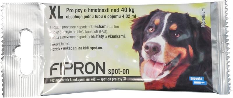 FIPRON 402 mg SPOT-ON roztok pro nakapání na kůži je antiparazitikum pro léčbu a prevenci napadení blechami a klíšťaty u psů a pro léčbu a kontrolu alergie na bleší kousnutí (FAD) u psů. Účinnost proti napadení blechami po dobu 2 měsíců, proti přisátí klíšťaty po dobu 1 měsíce. Balení obsahuje 1 pipetu.