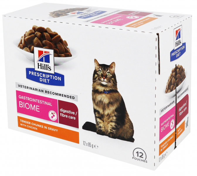 Hill's Prescription Diet Gastrointestinal Biome je vlhké krmivo pro kočky s vysokým obsahem vlákniny, u kterého bylo klinicky ověřeno, že podporuje pravidelnou zdravou stolici během 24 hodin a pomáhá snižovat riziko recidivy. Obohaceno o technologii ingrediencí ActivBiome+, která rychle vyživuje střevní mikrobiom a pomáhá zvládat složité GI problémy.