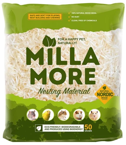 MILLAMORE materiál na hnízda je dřevitá vlna vyrobená z osikového dřeva. Je to měkký a bezprašný materiál, perfektní pro stavbu úkrytů a hnízd drobných savců a ptáků a udržení tělesné teploty při odpočinku a spánku. Obohacuje životní prostor v kleci, omezuje stres a podporuje welfare zvířat.