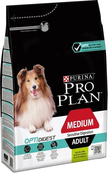PRO PLAN Medium Adult Sensitive Digestion s vysokým obsahem jehněčího. Kompletní krmivo pro dospělé psy středních plemen s citlivým zažíváním.