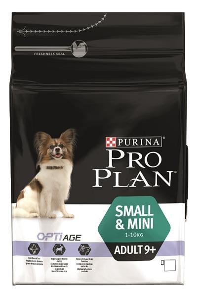 Purina® PRO PLAN® Small & Mini Adult 9+ s OPTIAGE pro psy malých a mini plemen starší 9 let. Granulované krmivo s vysokým obsahem kuřete.