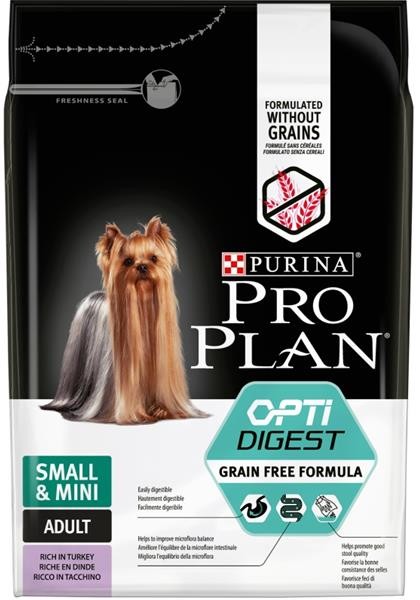 PURINA® PRO PLAN® Dog Small & Mini Adult Sensitive Digestion, s OPTIDIGEST® - GRAIN FREE receptura, s vysokým obsahem krůty. Kompletní krmivo bez obilovin vytvořené speciálně pro dospělé psy malých a trpasličích plemen se sklonem k problémům s trávením.