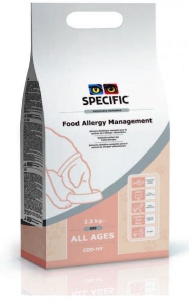 SPECIFIC CDD-HY Food Allergy Management je kompletní vyvážená hypoalergenní dieta s omezeným množstvím surovin (založená na rýži a hydrolyzované lososí bílkovině), která splňuje nutriční požadavky štěňat i dospělých psů s potravní alergií.